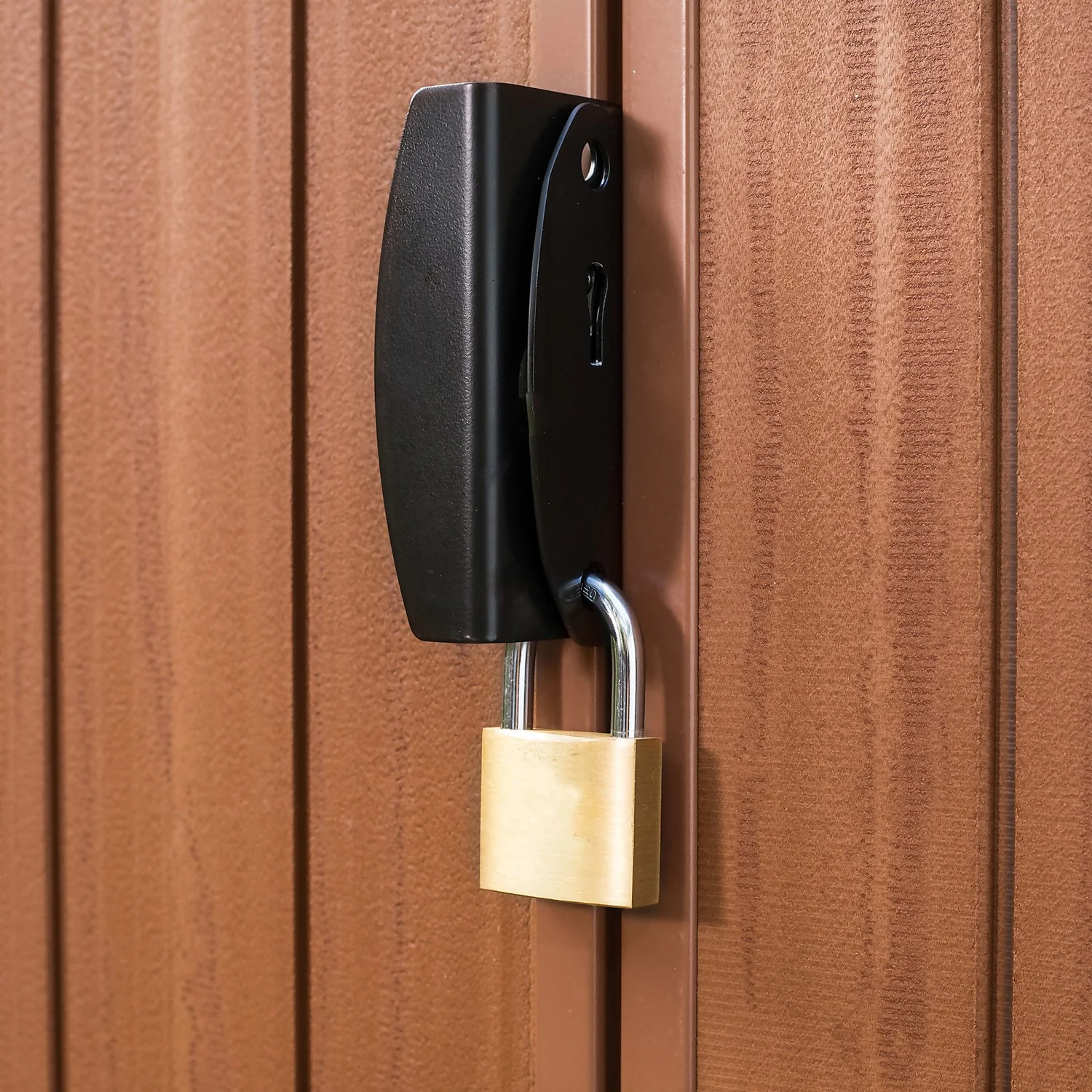 - Heavy duty floor panel with tongue and groove panels for easy assembly and lock hasp for additional security (Lock not included)