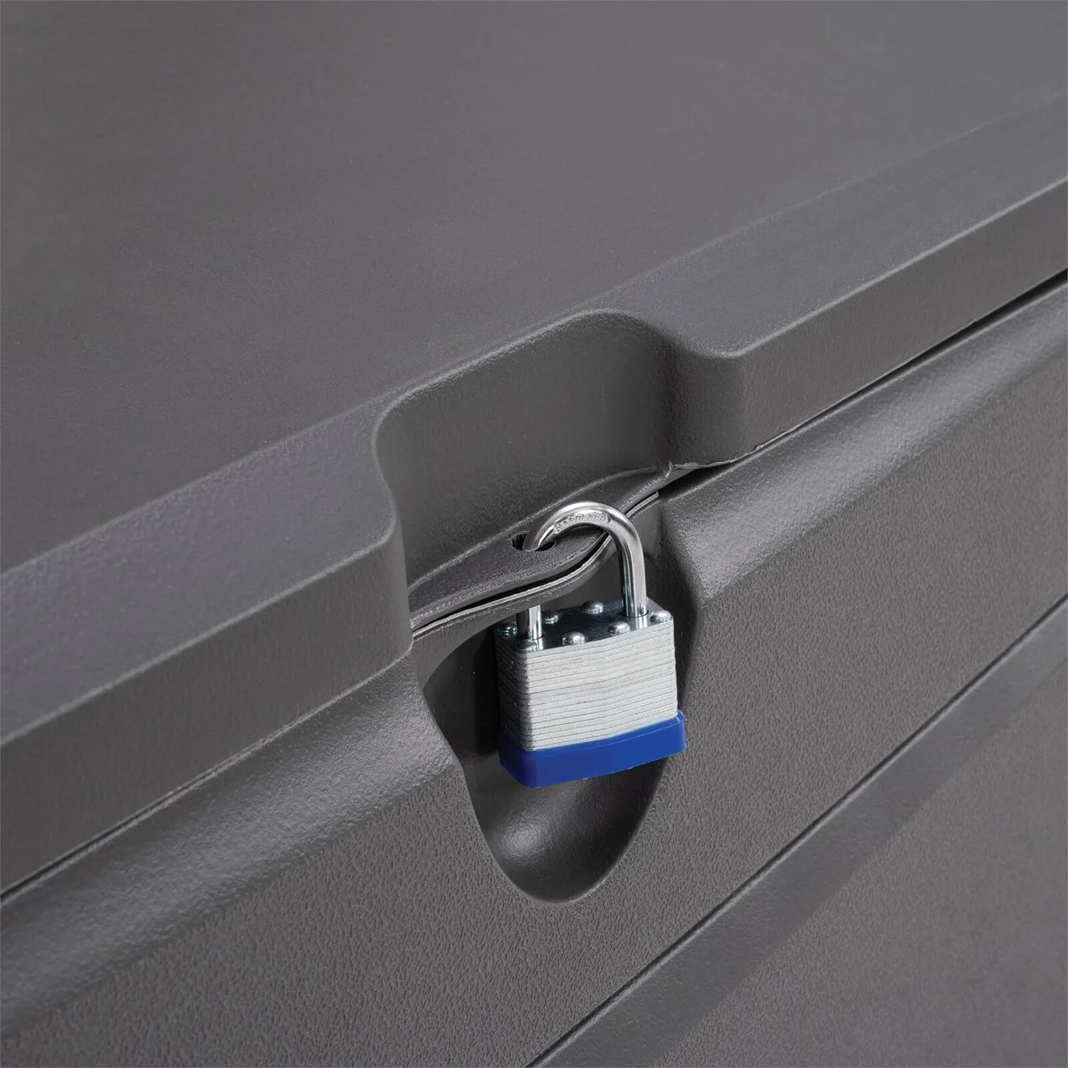 Lifetime Outdoor Storage Box – Features an interior capacity of 130 gallons. Comes in (1) box. 10-year limited warranty. Need to expand your patio storage, but have limited space available? Store your things outside in a Lifetime Storage Box. The rigid, double-wall, high-density polyethylene (HDPE) construction makes the box strong and durable. It’s UV-protected construction, and the weather and water resistant seal helps keep the interior dry. The spring-hinge lid opens greater than 90 degrees, won’t slam shut, and is lockable.