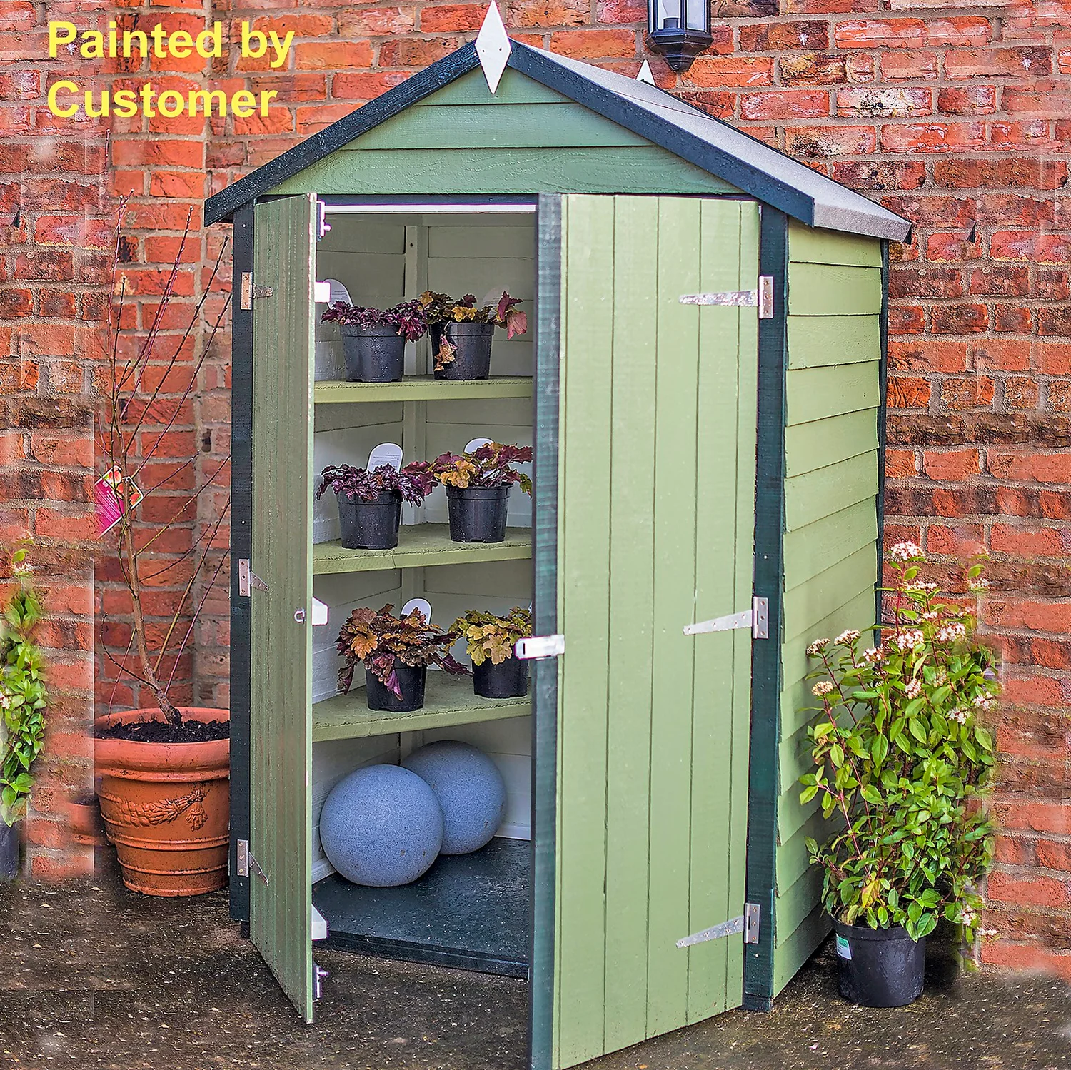 The 4 x 3 Overlap Double Door shed is distinguished from many of its competitors because of the wide double doors in the 4′ gable and the generous 6’4 height at its centre. This means that there is easy access to the entire space. This compact shed is manufactured from high grade, slow grown, FSC approved, European pine cladding boards over 34mm square framing. The doors are fitted with a hasp and staple catch ready for your own padlock. Both roof and floor are constructed from solid sheet OSB boards. There are no windows in this model.